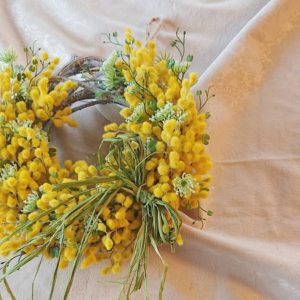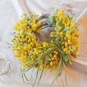 横幅が約28cmのミモザのリースです。少しリースベースを見せた三日月形です。