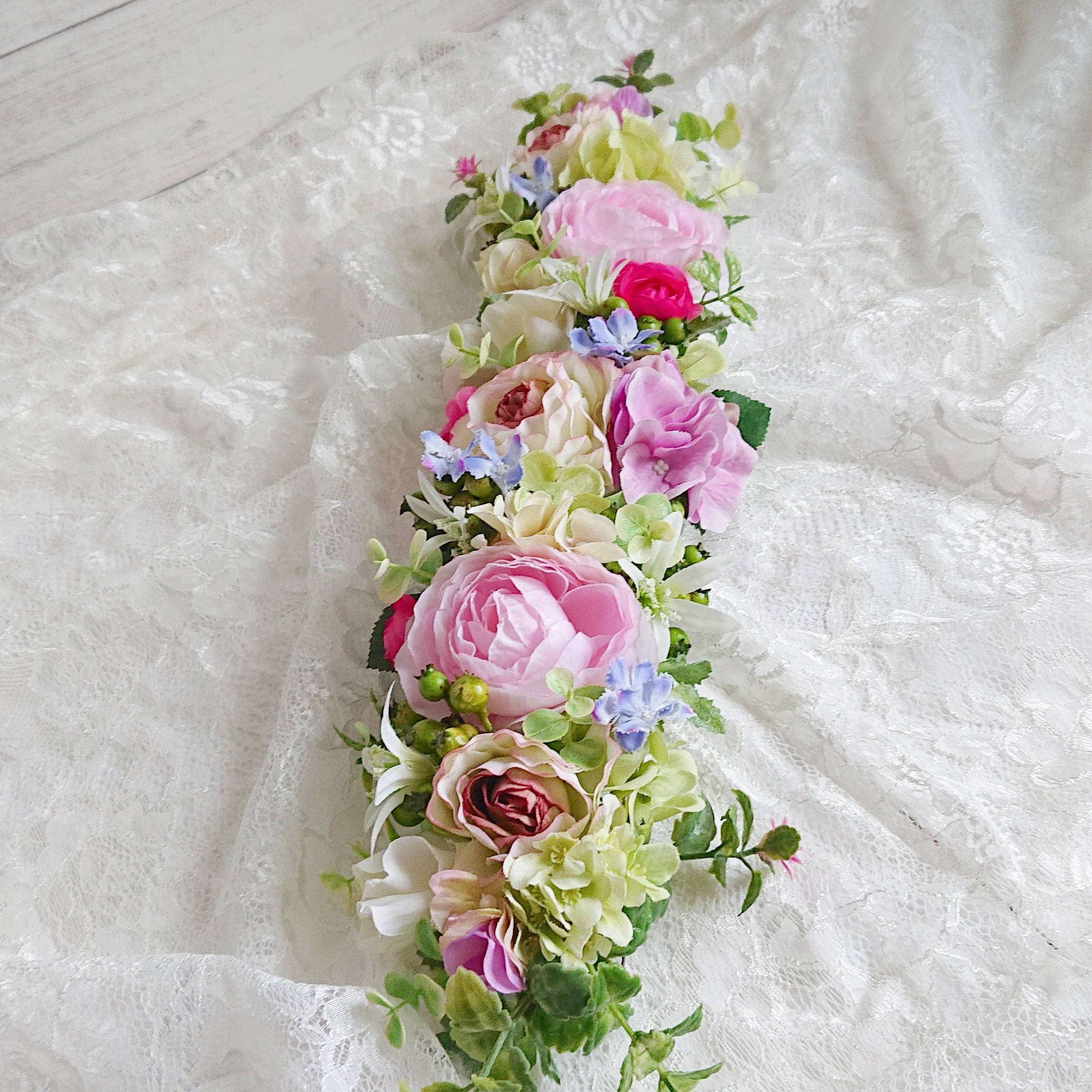 ワイヤリングしたお花を一つ一つ繋げていくスタイルのガーランドです♡