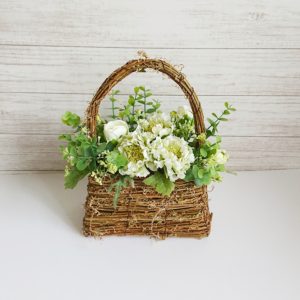 持ち手の長くスタイリッシュなカゴバスケットにパステルグリーンのお花のアレンジメントになります。
