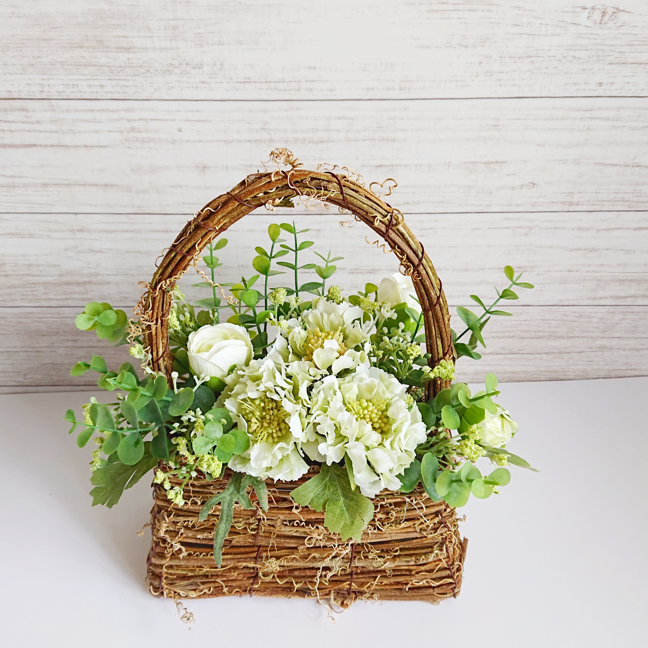 爽やかなホワイトグリーンのスカビオサを使って持ち手が長めで可愛らしいバスケットにアレンジです。