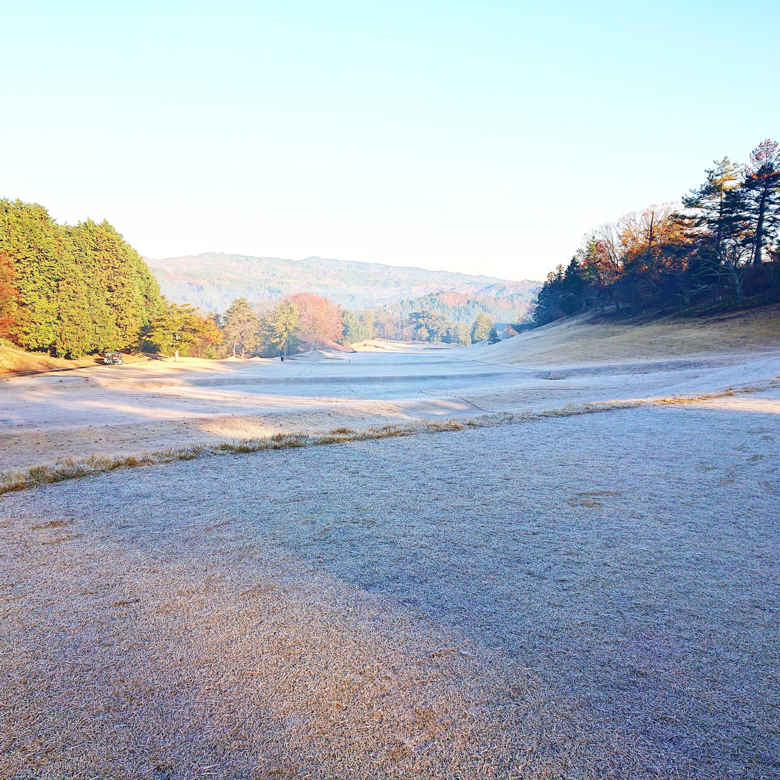 先日のゴルフ場は霜がおりて寒かったー。